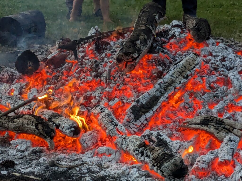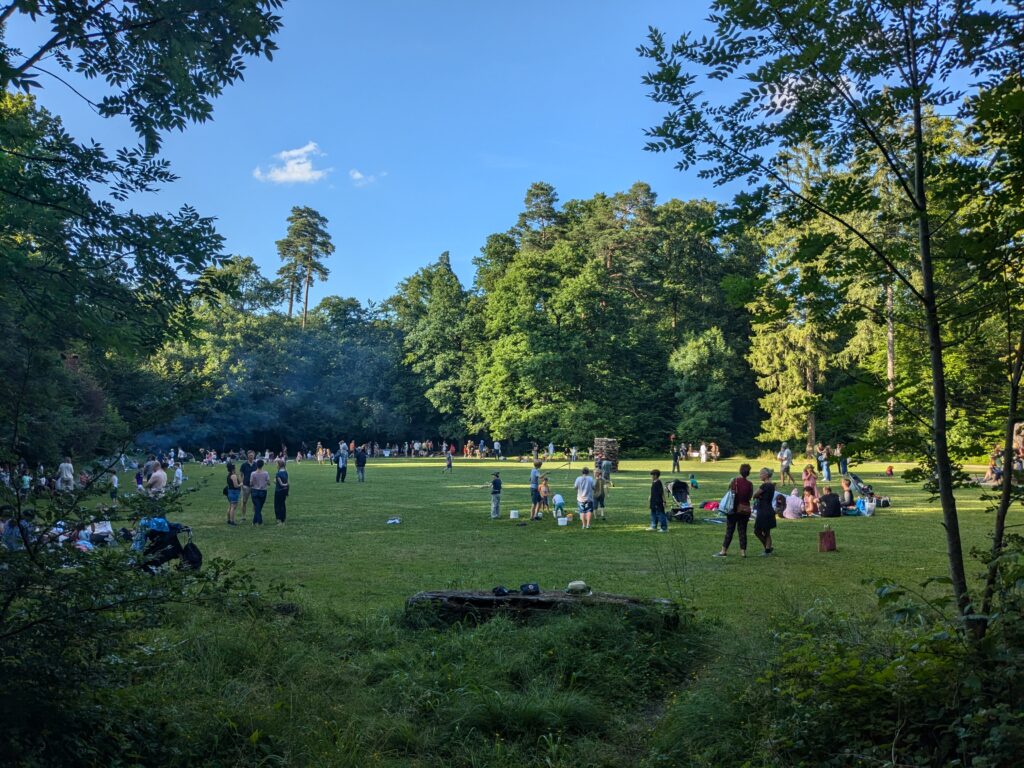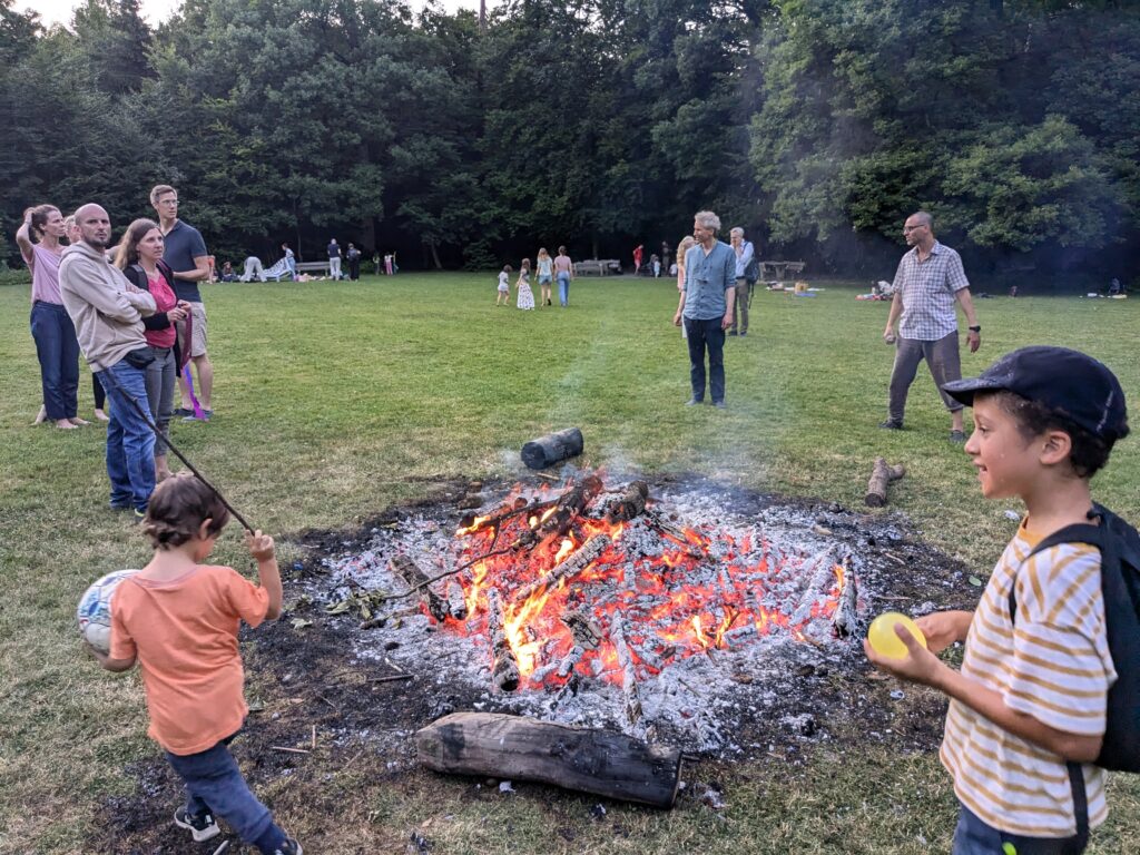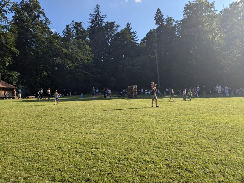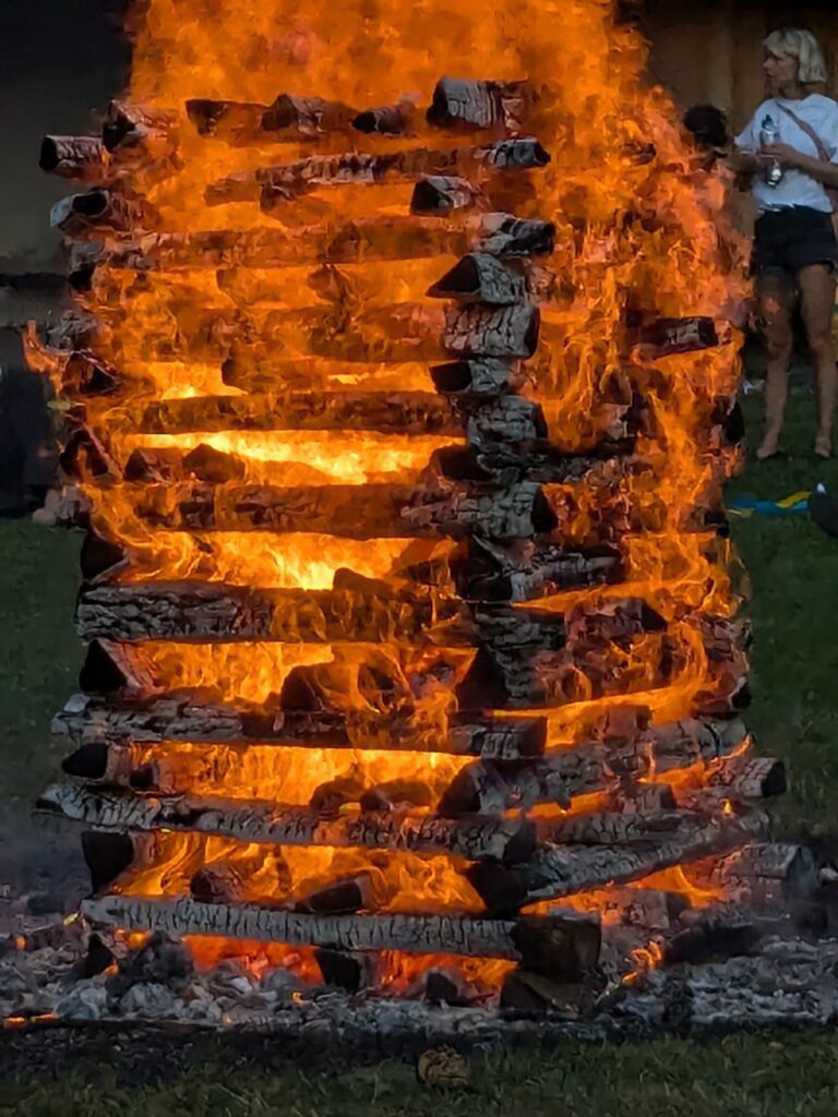 Die etwas älteren Buben unserer Waldspielgruppe haben das Holz fürs Feuer organisiert und geliefert. Ein knappes Ster lokales und getrocknetes Buchen- und Eschenholz in Meterstücken wurde fachgerecht aufgetürmt. Die Flammen tanzten meterhoch durch den Turm und erfreuten Jung und Alt. Wir freuen uns schon aufs nächste Mal.